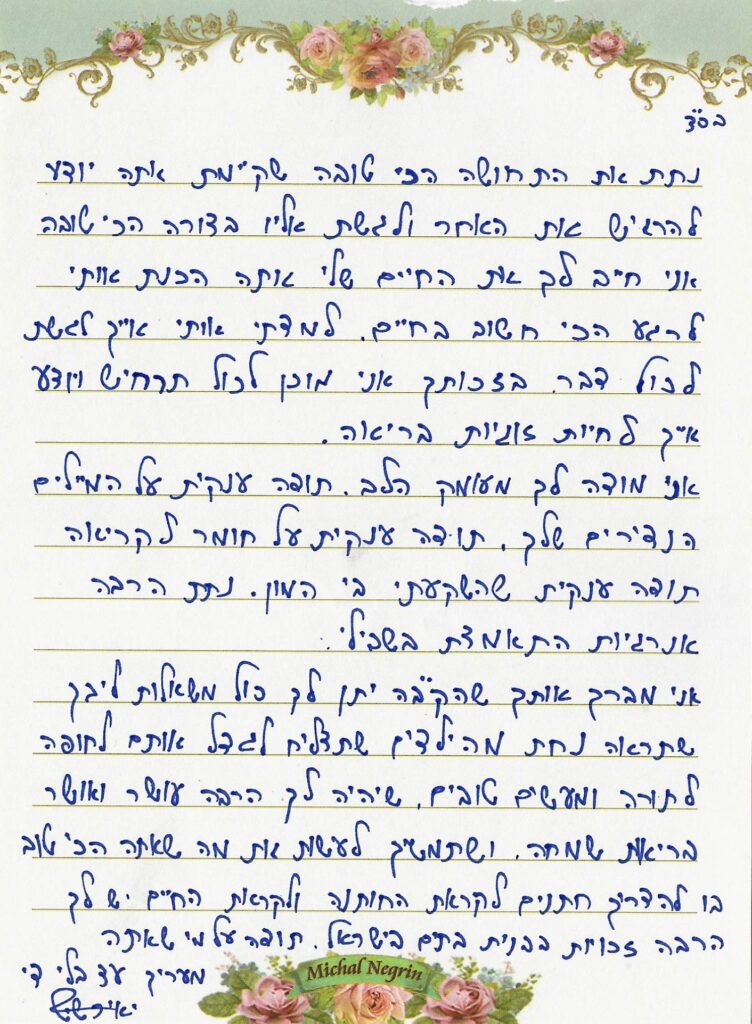 אני מברך אותך שהקב"ה יתן לך כול משאלות ליבך שתראה נחת מהילדים שתצליח לגדל אותם לחופה לתורה ומעשים טובים, שיהיה לך הרב עושר ואושר בריאות שמחה. ושתמשיך לעשות את מה שאתה הכי טוב בו להדריך חתנים לקראת החתונה ולקראת החיים יש לך הרבה זכויות בבניית בתים בישראל.